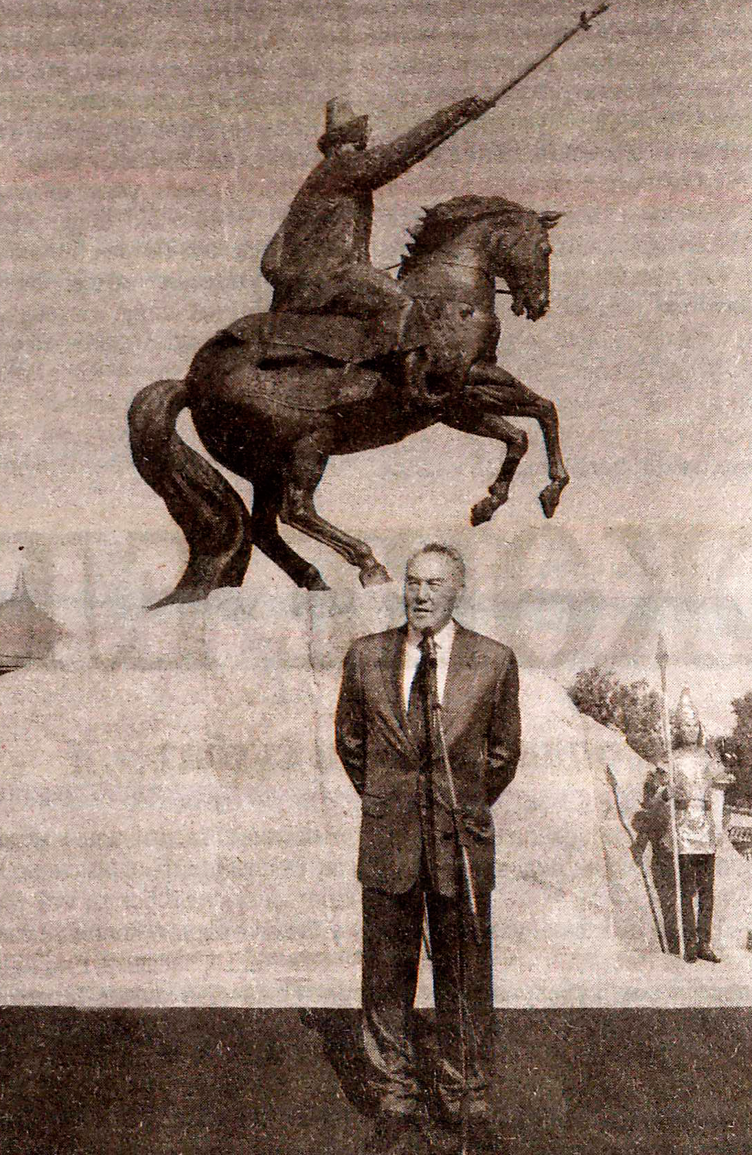 Ескерткіштен бастап, ақ үйдің алдына дейін "алтын адам" киімін киген сарбаздар сап тузеді. Ақ түйенің қарны жарылған қуанышты сәтті көп күткен облыс тұрғындарына жылы лебізін білдірген Елбасы:
