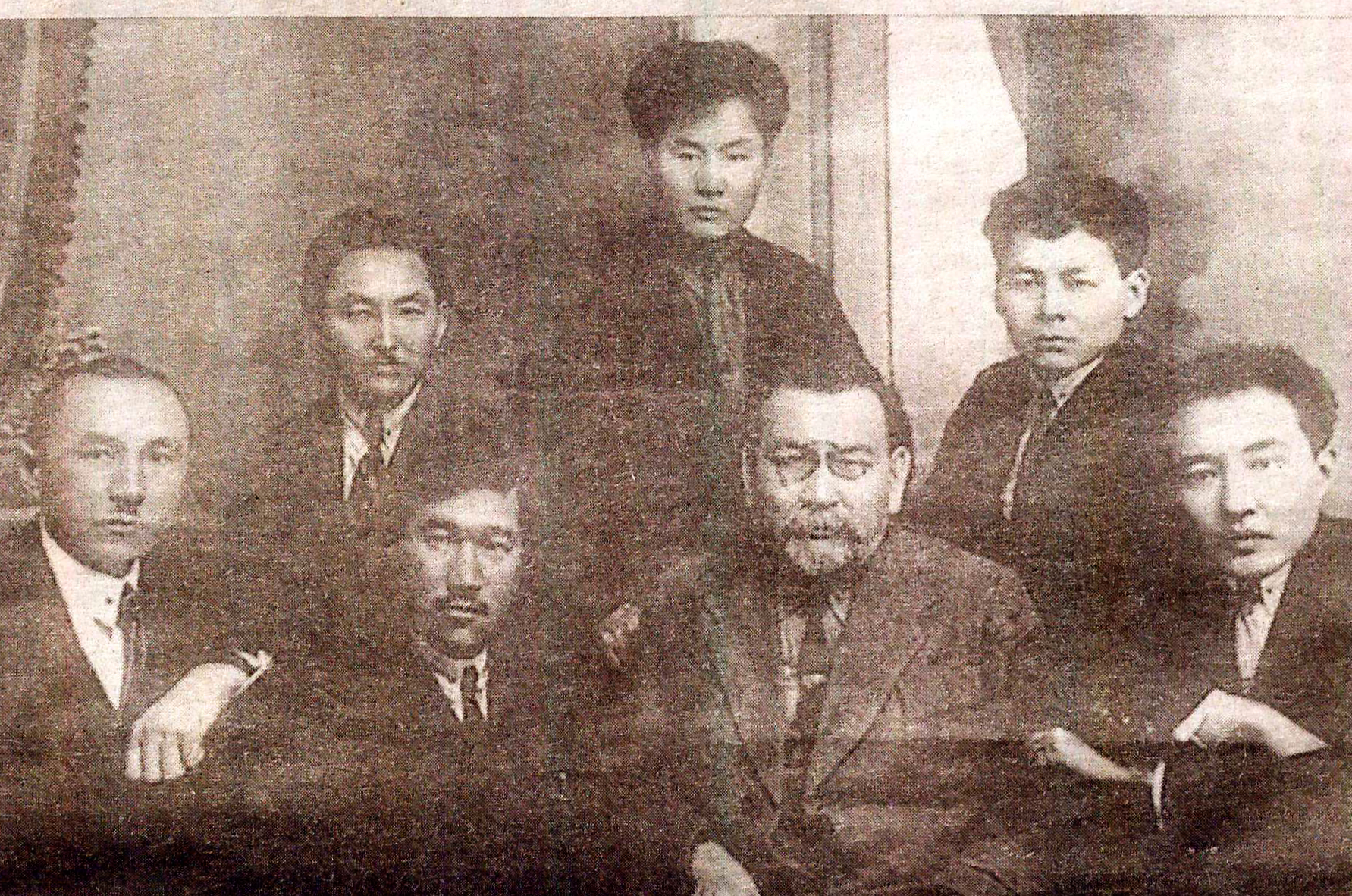 Суретте халқымыздың ардақты перзенттері: алдыңғы қатарда (солдан оңға қарай): Халел Ғаббасов, Міржақып Дулатұлы, Ахмет Байтұрсынұлы, Мұхтар Әуезов; екінші қатарда (солдан оңға қарай): Жүсіпбек Аймауытов, Әлкей Марғұлаң Абдолла Байтасұлы бейнеленген