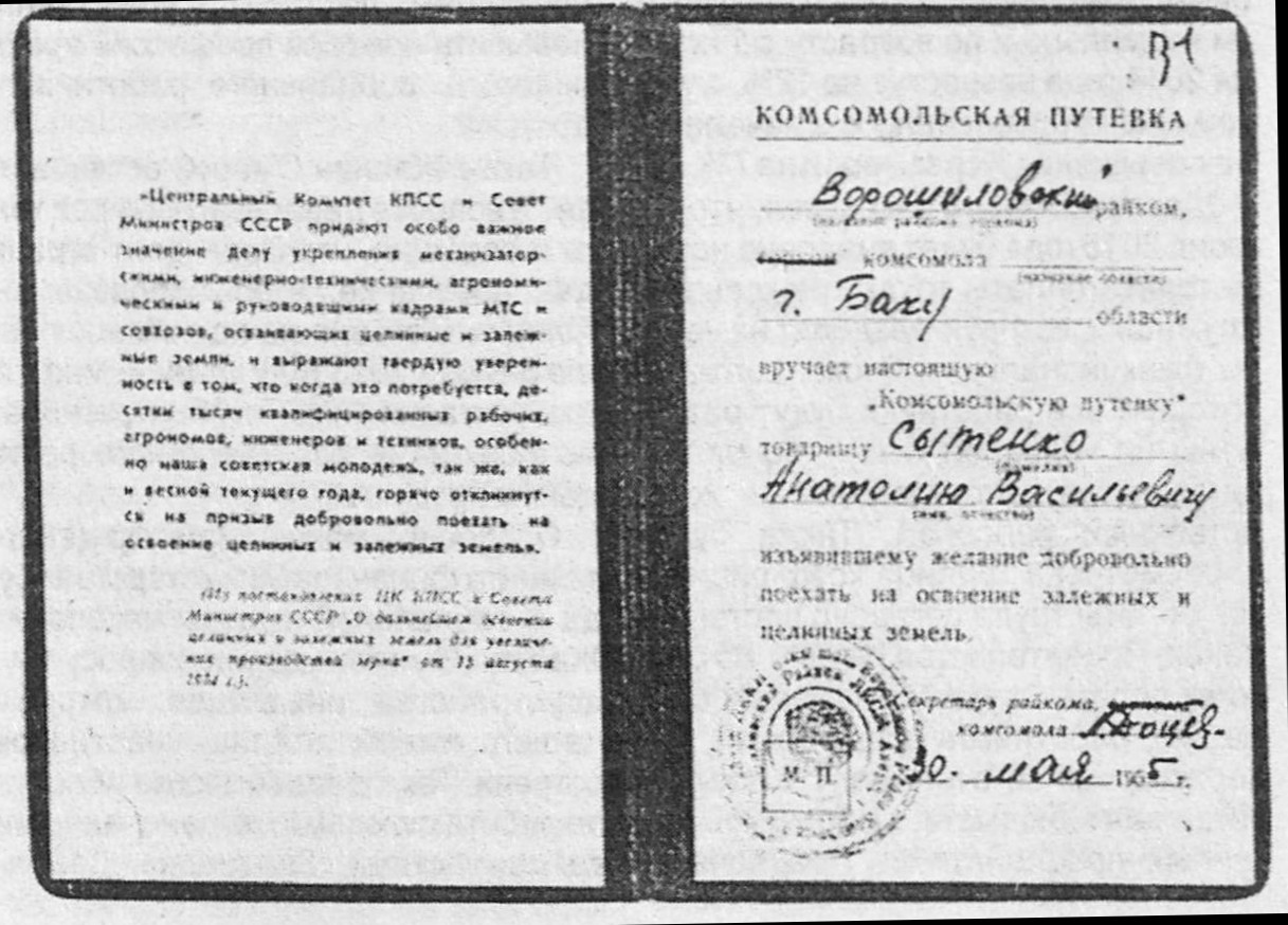Немало первоцелинников продолжили учебу в вечерних школах, а затем заочно в вузах, стали специалистами, руководителями хозяйств. Например, приехавший из Сумской области Павел Шамрай начинал рабочим, вырос до секретаря парткома совхоза «Украинский». Затем был избран вторым секретарем Жамбылского райкома партии. В совхоз им. Молодогвардейцев по путевке комсомола прибыл адыгеец Аслан Не-хай. Он прокладывал первую борозду в новом хозяйстве. Возил на быках воду из озера. Учился, окончил вуз. Работал директором крупнейшего в области совхоза им. С.М.Кирова, затем - заместителем председателя исполкома районного Совета и на других руководящих должностях. Комсомольская путевка, которая привела Аслана на целину, хранится в музее Революции в Москве. Такие биографии у целинников.