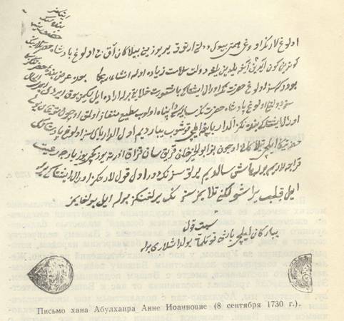 Письмо хана Младшего жуза Абулхаира Анне Иоанновне с просьбой принять его с подвластными ему людьми в российское подданство