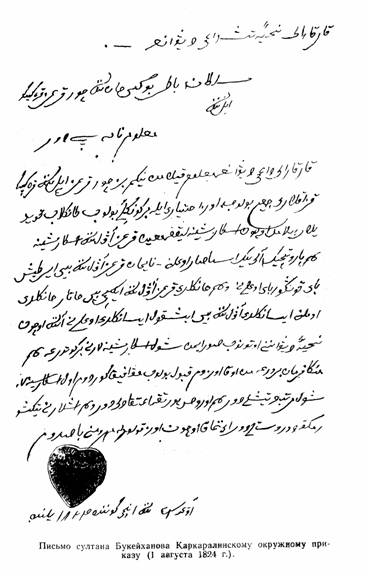 Письмо султана Букейханова Каркаралинскому окружному приказу об избрании правителей аулов