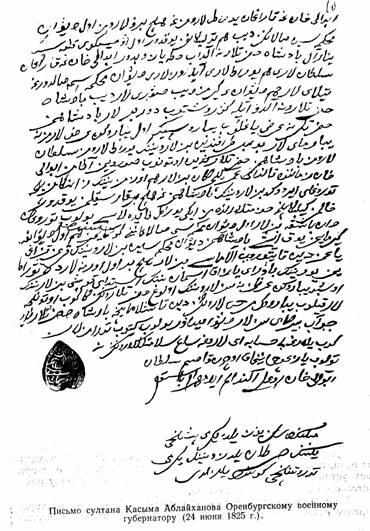 Считаю долгом довести до сведения Вашего благородия и известить Вас о том, что между моими ордынцами нет никакого спокойствия, что меня очень огорчает. Кроме этого, находящийся в Омске господин генерал Капцевич учредил присутственные места при горе Кокчетаве, которая находится на нашей киргиз-казахской степной стороне и принуждает наших султанов и старшин иметь в этих местах заседания с немалыми для них обидами. Наши ордынцы с султанами и старшинами иа это не согласны, они не одобряют учреждение этих судебных мест, потому что об открытии их из людей, верных Аблай хану, никто не просил, а омский генерал входил с представлением к государю императору несправедливо и неправильно, заявляя, что будто бы люди, верные Аблай хану, султаны и ордынцы сами просят учредить эти судебные места и желают в них продолжать заседания. Хотя мы отправили государю императору плачевную жалобу, но знаем хорошо, что ее не пропустили через Сибирскую сторону.