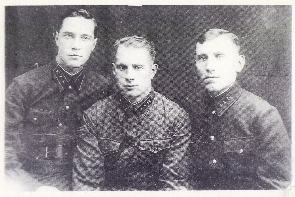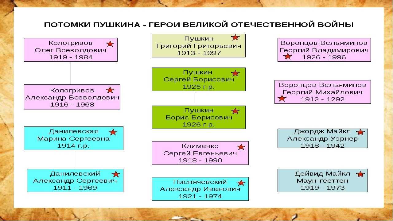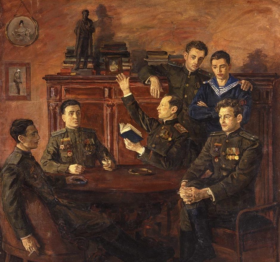 На картине — рядовой, краснофлотец, сержант, два лейтенанта и один старший лейтенант, — правнуки и праправнуки великого поэта, которые участвовали в боях (их кители украшают боевые ордена и медали), лежали в госпиталях (на левой стороне груди почти у каждого нашивки — ленточки красного и желтого цвета, свидетельство ранений), cнова возвращались на передовую — и дошли до Берлина. Вот их краткие биографии. Братья Кологривовы. Война разлучила братьев Кологривовых почти на четыре года, но фронтовые дороги вели их в одном направлении — от Москвы до Берлина. Старший брат, Александр Всеволодович (1916—1968), курсант, с начала войны был направлен военкоматом в Муромское училище связи. В октябре 1941 г. он в составе стрелковой бригады Центрального фронта участвовал в сражении под Москвой. Когда немцы стояли в 18 км от столицы и обстреливали ее, часть, в которой служил командир отделения связи Александр Кологривов, стойко держала оборону в районе Красной поляны, под Истрой, под Волоколамском. В феврале 1942 г. под Вязьмой он был ранен в ногу, а после выздоровления снова направлен в Муромское училище связи. В апреле 1942 г. Александр в звании младшего лейтенанта снова отправляется на фронт. Командир взвода связи одной из стрелковых дивизий 2-го Белорусского фронта, Александр форсировал Одер. Под шквальным огнем противника он перевозил в лодке кабель — для того, чтобы как можно быстрее установить связь между наступавшими подразделениями наших войск. — В ту весну, — рассказывал Александр Кологривов, — река разлилась на 2—3 км. Под свинцовым дождем связисты прокладывали кабель, обеспечивая связь. Приказ был один: продержаться хотя бы сутки. Получилось иначе: укрывшись среди кустов поймы, отвлекая огонь на себя, мы просидели в лодке 10 суток… Младший брат, Олег Всеволодович Кологривов (1919—1984), будучи студентом 3-го курса Института прикладного и декоративного искусства, вступил в народное ополчение в начале Великой Отечественной войны. Боевое крещение он получил в подразделениях МПВО — тушил на крышах домов зажигательные бомбы, которые сбрасывали на столицу немецкие самолеты. 6 декабря, перед долгожданным контрнаступлением под Москвой, Олега ранило осколком разорвавшейся рядом мины. Около трех километров полз он по снегу до медпункта. Вылечился, а в 1942 г. в составе 19-й гвардейской Като-Курганской дивизии минометчик Олег Кологривов участвовал в прорыве блокады Ленинграда. В том же году на Волховском фронте в тяжелых боях на Синявских болотах гвардии рядовой Олег Кологривов был тяжело ранен в грудь навылет. После выздоровления он участвовал в освобождении Гдова, Пскова, Порхова — на земле, кровно связанной с его великим предком, близ Михайловского. И снова был ранен. Боевой путь Олега Кологривова проходил через Прибалтику, Варшаву, Восточную Пруссию. Всю войну братья воевали на разных фронтах, ничего не зная друг о друге. А встретились в Берлине в октябре 1945 г. на соревнованиях между фронтами по плаванию — оба были отличными пловцами. Здесь Александр и увидел своего младшего брата, имя которого объявили по радио, как занявшего 4-е место по плаванию брасом. Олег удостоился личного поздравления — рукопожатия маршала К.К.Рокоссовского и памятного подарка из его рук.