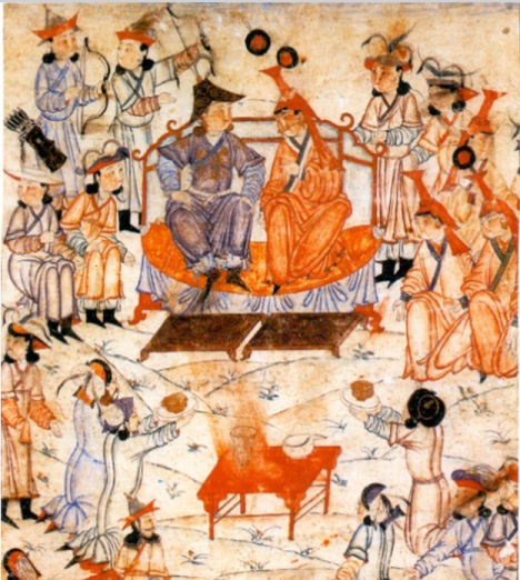 О троне великого хана Угедея (третий сын Чингисхана и преемник отца в качестве кагана Монгольской империи) свидетельствует китайский дипломат Сюй Тин (1235–1236): "Кресло, в котором восседает татарский правитель в шатре, – как сиденье проповедника в буддийском монастыре и также украшено золотом". Плано Карпини, францисканский монах, посетивший в XIII веке ставку Батыя и столицу монгольской империи Каракорум, тоже обратил внимание на трон тогдашнего хана Гуюка: "Трон же был удивительным образом вырезан из слоновой кости. На нем также были золото и драгоценные камни и, если мы правильно помним, жемчуга. И по ступеньям он поднимался на этот [помост], который сзади был круглым".