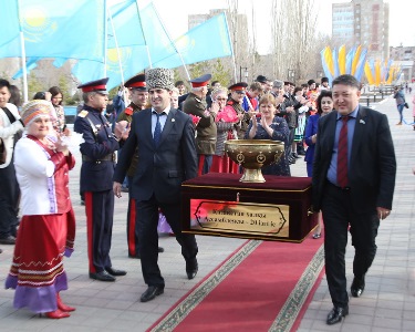 Қасиетті Түркістан қаласынан бастау алған «Қазақстан халқы Ассамблеясы – 20 ізгі іс» республикалық «Тайқазан» эстафетасы Қарағанды облысына да жетіп, оны салтанатты түрде Астанаға табыстау рәсімі өткен еді. Еліміздің мерейлі мерекесіне арналған барлық облыстардың игі істері мен тамаша табыстары тартуы ретінде тізімін мұның алдында қызылордалықтар толықтырып салған Тайқазанды Сыр өңірінен аймақтан Қазақстан халқы Ассамблеясы мүшелерінен құралған делегация жеткізген еді.