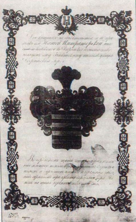 Об этом и свидетельствует гербовая грамота ручной работы на четырех листах плотной лощеной бумаги. На каждой странице рукописный текст заключен в рамку, представляющую собой богато орнаментированную кайму. На первой странице изображены герб Российской империи и гербы губерний. Третья страница содержит биографию обладателя грамоты. Пятая отведена для изображения дворянского герба. Фамильный герб представляет собой четырехугольный с закругленными нижними углами темно-красный (червленый) геральдический щит с четырьмя горизонтальными золотыми полосами (почетными геральдическими фигурами). Щит увенчан дворянским шлемом, бурлетом (жгутик их ткани) и наметом (прикрепленная к шлему материя). Над бурлетом три темно- красных страусовых пера. Серебряный герб вместе с личной печатью Николая I находится в специальной серебряной гербовой коробочке.