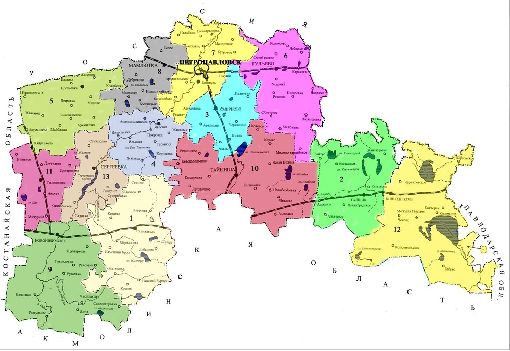 • районы: Айыртауский (райцентр -с. Саумалколь, 9,6 тыс. кв. км, кол-во аулов - 88), Акжарский (райцентр - с. Талшик, 8,04 тыс. кв. км, кол-во аулов - 25), Аккайынский (райцентр - с. Смирново, 4,71 тыс. кв. км, кол-во аулов -33), Есильский (райцентр - с. Явленка, 5,14 тыс. кв. км, кол-во аулов - 60), Жам-былский (райцентр - с. Пресновка, 7,47 тыс. кв. км, кол-во аулов - 60), Магжана Жумабаева (райцентр-г. Булаево, 7,81 тыс. кв. км, кол-во аулов - 69), Кызыл-жарский (райцентр - а. Бесколь, 6,15 тыс. кв. км, кол-во аулов - 72), Мамлютский (райцентр - г. Мамлютка, 4,10 тыс. кв. км, кол-во аулов - 43), имени Габита Мусрепова (райцентр - с. Новоишимское, 11,09 тыс. кв. км, кол-во аулов - 68), Тайыншинский (райцентр - г. Тайынша, 11,43 тыс. кв. км, кол-во аулов -90), Тимирязевский (райцентр - с. Тимирязево, 4,51 кв. км, кол-во аулов - 25), Уалихановский (райцентр - с. Кишкенеколь , 12,88 тыс. кв. км, кол-во аулов -33), Шал акына (райцентр - г. Сергеевка, 4,84 тыс. кв. км, кол-во аулов-43).