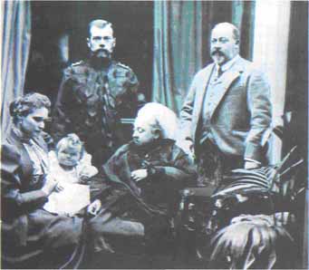 Семья Романовых. Императрица Александра Федоровна с великой княжной Татьяной на руках, император Николай II, королева Виктория и ее сын Альберт-Эдуард. 1898 г.
