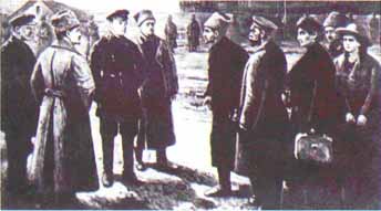 В 1 927 году предполагалось отметить годовщину рас стрела. Художник В.Н. Пчелин получил заказ написать это историческое полотно. Художник беседовал с очевидцами и участниками расстрела. Ему удалось передать суровую атмосферу того хмурого апрельского утра, когда на платформу в Екатеринбурге окруженные красноармейцами сошли Николай с царицей и дочерью Марией. На этой же картине мы видим и жертву, и убийц: Голощекина, Юровского. Юровский выступал с лекциями перед пионерами и комсомольцами, с подробностями убийства царской семьи, и при этом показывал кольт и маузер, из которых было совершено убийство. Это оружие он предлагал сдать в музей революции. Но годовщина казни не состоялась, и экспонаты не пригодились. Картину уничтожили. Но с картины было сделано несколько фотооткрыток. Эти открытки хранились в семьях убийц. Вы видите фотокопию картины Пчелина, которая хранилась в семье Л.А. Козловой. Но и у нас в Петропавловске оказались дальние родственники Голощекина, и у них такая открытка хранилась, только они не знали, что за событие изображено на данной открытке. Позднее убийцы царя были расстреляны как троцкисты. Только Юровский заболел и умер свой смертью, не дожив до расстрела, который был ему обеспечен.